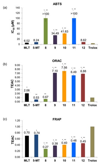 The antioxidant capacities of MLT and its derivatives on (a) ABTS, (b) ORAC, and (c) FRAP assays. Data represented mean ± SD (n = 3). * p < 0.05 compared with trolox, ** p < 0.05 compared with MLT.