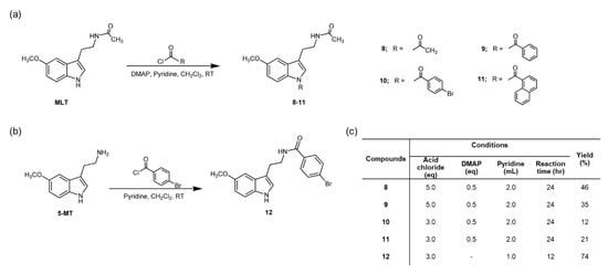 The proposed reactions and structure of N-amide melatonin (MLT) derivatives in this study. (a) Compounds 8–11, (b) compound 12, and (c) conditions.