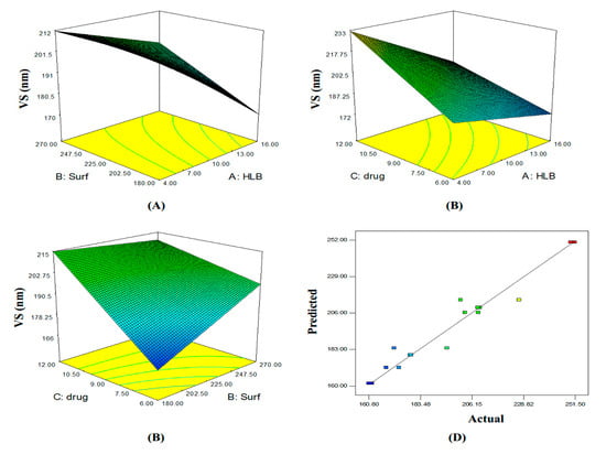 ANOVA analysis revealed that all independent variables significantly affected the vesicles size (p < 0.05). The 3D response surface plots and the quantitative linear relationship between resultant vesicle size responses with that of the predicted value of all dependent variables are illustrated in Figure 1. The following equation represents the linear regression models for the vesicle size (VS) obtained from the factorial study: