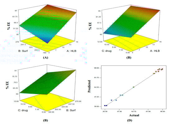 The 3D response surface plots and the quantitative linear relationship between results of the %EE response with that of the predicted value for all dependent variables are shown in Figure 2.