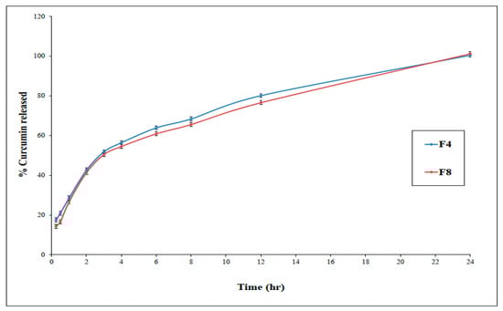 In-vitro release of curcumin from optimized proniosomal gel formulations F4 and F8 (±SD, n = 3).