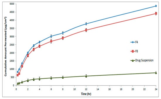 The drug flux (permeation rate) at steady state (JSS) was calculated from the slope of linear plot between cumulative amount permeated and time []. The permeability coefficient (KP) was computed using the following equation:
