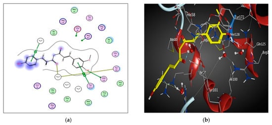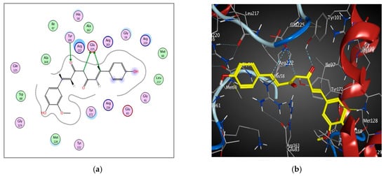 2D diagram (a) and 3D representation (b) showing the binding mode of curcumin (yellow) with 1KI4 thymidine kinase binding pocket.