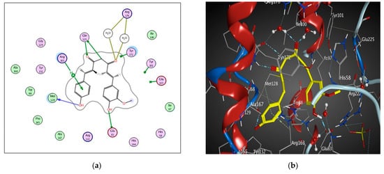2D diagram (a) and 3D representation (b) showing the binding mode of curcumin (yellow) with the 1E2P thymidine kinase binding pocket.