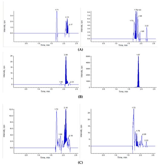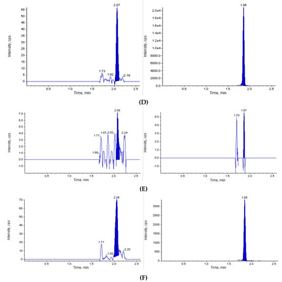 Chromatographic plots from the in vivo investigation of the acute toxicity of Les-3833 in male Balb/c mice. (A) blank plasma sample, (B) blank plasma spiked with Les-3833 (5 ng/mL, left panel) and internal standard (IS, dactinomycin, right panel), (C) blank brain sample, (D) blank brain sample spiked with Les-3833 (10 ng/g, left panel) and IS (right panel), (E) blank liver sample, and (F) blank liver sample spiked with Les-3833 (50 ng/g, left panel) and IS (right panel).