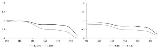 Spectra obtained from the F2 and F4 formulations. BR-Before Radiating; IR-Irradiated.