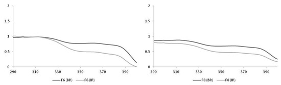 When the vehicle was changed from emulsifying polymer to Crodafos® CES self-emulsifying base, it was found that F6 and F8 (before and after the irradiation process) maintained the critical wavelength (λc) in the recommended value (370 nm) for promoting action in the broad spectrum [24,25,36]. Regarding the SPF of the formulations, the F6—containing only filters—presented a much higher value than F8, composed of filters and B. braunii microalgae dry biomass (Table 3 and Figure 2).