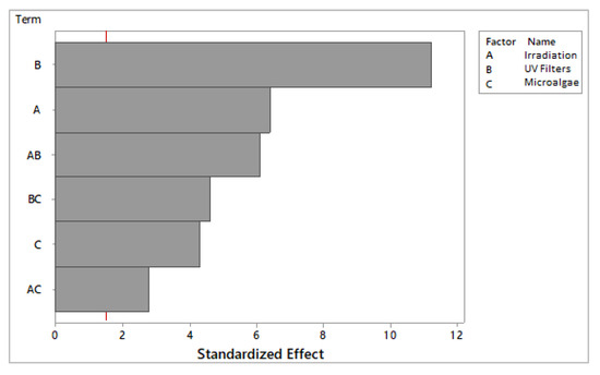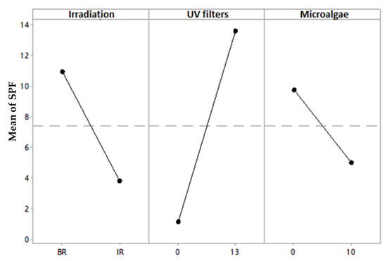 Figure 3 shows that all variables influenced the effect of the SPF of F6 to F8, and the filters contributed the most to this effect (Figure 4). It was verified that the irradiation and the microalgae incorporation promoted SPF reduction in the formulation and only the UV filters were responsible for the photoprotective action [37].