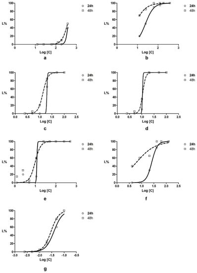 Daphnia magna lethality curves for (a) Plantago lanceolata extract; (b) Aesculus hippocastanum extract; (c) Achillea millefolium volatile oil; (d), Taxodium distichum volatile oil; (e) mixture of the four active components in ratio of 1.5:0.5:1:1 (g:g:mL:mL); (f) diclofenac and (g) α-pinene.