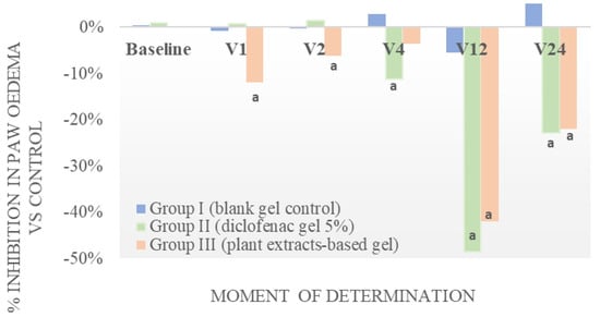 The anti-inflammatory activity of the active gel was determined using the plethysmometric method, as described by [31]. Inflammation was induced in 24 male Wistar rats, distributed into 3 equal experimental groups (n = 8). The animals were anesthetized intraperitoneally with a 13% urethane solution, 1300 mg/kg b.w. After general anesthesia induction, the initial hind paw volume was determined with the plethysmometer (Ugo Basile, Gemonio, Italy). Thereafter, 0.2 g of each treatment gel was applied to the surface of the right paw and massaged gently 50 times with the index finger, while the left paw was only massaged (control). The topical gels that were used as treatments are: group I—blank gel (control), group II—diclofenac 5%, group III—plant extracts-based gel (active gel)