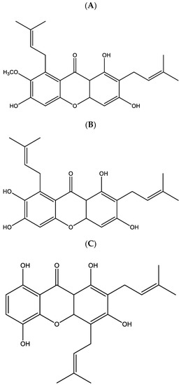 The Chemical structures of (A) α-mangostin (AM), (B) γ-mangostin (GM), and (C) gartanin (GT) [3].