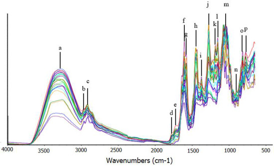 FTIR spectra of mangosteen pericarp extract were shown in Figure 3. In this study, the analysis of GM, GT, and AM compounds using FTIR spectrophotometry was performed at wavenumber 4000–650 cm−1 and scanned in the absorbance form. For interpretation FTIR spectra of mangosteen pericarp extract, the absorption band at (a) 3317 cm−1 is stretching vibration of hydrogen bonded (–OH), while bands at (b) 2953 cm−1 and (c) 2922 cm−1 correspond to asymmetric stretching vibration of methyl (CH3), asymmetric stretching vibration of methylene (CH2–) groups, respectively. The bands at (d) 1760 cm−1 and (e) 1741 cm−1 comes from stretching vibration of unconjugated carbonyl (C=O) group. The strong band at (f) 1654 cm−1 comes from stretching vibration of unconjugated C=C. The band at (g) 1590 cm−1 corresponds to stretching vibration conjugated C=C. The strong band at (h) 1409 cm−1 comes from CH2– bending, while the bands at (i) 1367 cm−1 comes from CH3− bending. The bands at (j) 1278 cm−1, (k) 1206 cm−1, (l) 1046 cm−1 correspond to the stretching vibration of C–O. The bands at (m) 1011 cm−1, (n) 908 cm−1, (o) 772 cm−1, (p) 677 cm−1 comes from C–OH stretching, –HC=CH– (trans) out of plane, –HC=CH– (cis) out of plane, –(CH2)n; –HC=CH-bending, respectively [11].