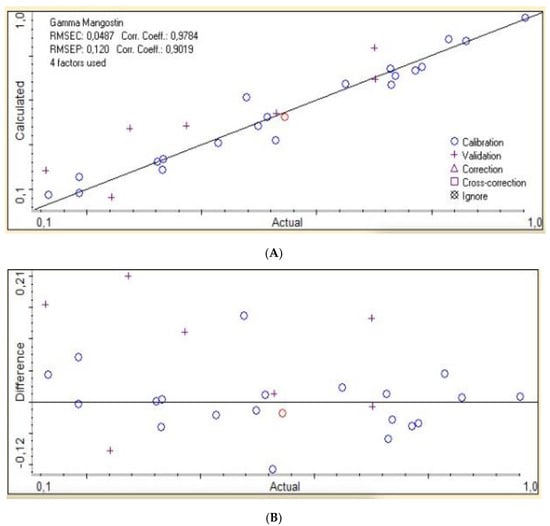The Partial Least Square regression (PLSR) between actual values of γ-mangostin combined with wavenumbers region 3700–2700 cm−1 using the second derivative FTIR (A), along with residual analysis (B).