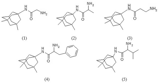 Memantine analogues with amino acids: alanyl-memantine Ala-MEM (1), β-alanyl-memantine βAla-MEM (2), glycyl-memantine Gly-MEM (3), phenylalanyl-memantine Phe-MEM (4) and valyl-memantine Val-MEM (5).