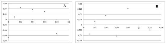 The linearity of the calibration functions was examined visually by the residual deviation plot graphical method [18]. When the lowest and highest points of the calibration graphic are on the same side of the most probable straight line, while the middle part is on the other side, this is a clear indication that the real function is non-linear. In such cases, second order polynomials were tested as a calibration model. The final decision for use of non-linear calibration functions was confirmed by the Fisher’s F-test [19]. In most of the cases, the calibration function appeared to be non-linear with only one exception—the case of Ala-MEM where the function suggested as linear. According to the literature data and previous studies, in most of the cases, the hydrolysis of drugs is following zero or first order kinetics. Zero order implies concentration-independent rate and linear function: . In case of first or pseudo-first order kinetics, the reaction rate depends on the concentration of one reactant and linearity can be achieved in coordinates: . The linearity of the kinetic curves in the present study was evaluated by Pearson’s correlation coefficient and Student’s t-test. It should be noted that practically always when , the application of other linearity tests also provides positive results. These tests were applied both for examination of zero order (first function) first or pseudo first order (second function). In both cases, the slope of the regression line is equal to the rate constant of the process.