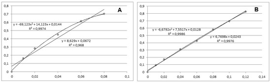 Respective comparisons between linear and second order polynomial calibration graphics for the same examples are presented in Figure 3.