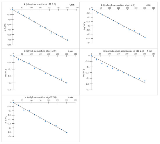 Changing of concentration of the examined memantine derivatives with time at pH 2.0.