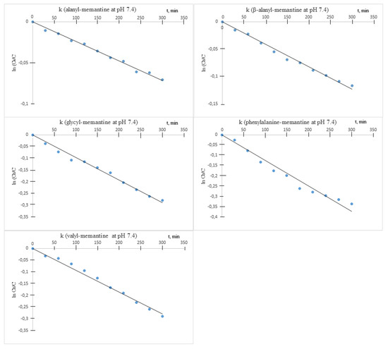 Changing of concentration of the examined memantine derivatives with time at pH 7.4.