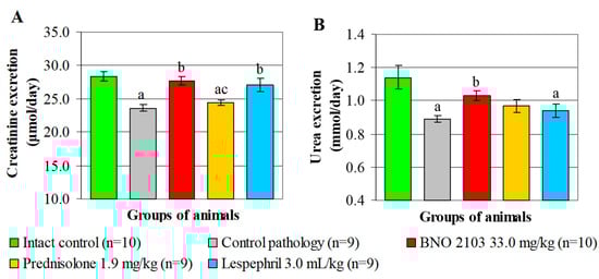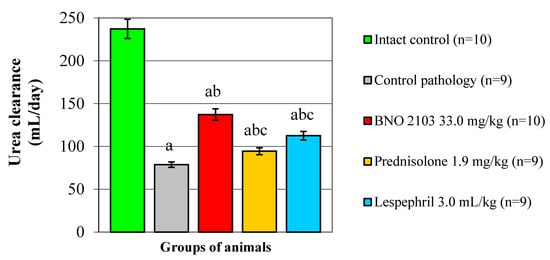 Under the influence of BNO 2103, positive changes occurred in the indicators of nitrogen metabolism. The study drug increased (p < 0.05) the urinary excretion of creatinine by 17.4%, the urea by 15.7% and the UC by 1.7-fold, correspondingly (Figure 1 and Figure 2). As a result, the creatinine and blood urea decreased (p < 0.05) by 1.4–1.5 times, which indicates a decrease in the manifestations of azotemia and normalization of nitrogen metabolism. Accordingly, Prednisolone increased the UC by 19.0% and had no probable effect on the excretion of nitrogen compounds (Figure 1 and Figure 2). As a result, the blood creatinine increased by only 10.5% (p < 0.05), and the urea changed insignificantly. Lespephril had a moderate hypoazotemic effect, increasing (p < 0.05) the creatinine excretion by 14.9% and the UC by 43.0% (Figure 1 and Figure 2), while the creatinine and blood urea decreased 1.4-fold. Compared to Prednisolone, BNO 2103 increased the UC by 45.3% (p < 0.05). BNO 2103 also exceeded prednisolone (p < 0.05) by 21.9% and 26.0% in terms of the effect on the creatinine and blood urea, respectively. Additionally, BNO 2103 increased the UC level 22.0% more significantly than Lespephril (p < 0.05).