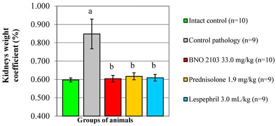 Influence of BNO 2103 on the kidneys’ weight coefficient in rats with renal failure. Data are expressed as mean ± SEM (n is the number of animals at the end of experiment); a p < 0.05 vs. intact control group; b p < 0.05 vs. control pathology group.