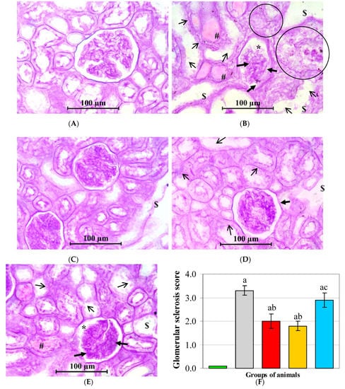 Paraffin sections (5 µm thick) were mounted on slides and stained with periodic acid-Schiff (PAS). The sections were examined under the light microscope “Optika B-1000BF” and photographed with the digital camera “Optikam HDMI Pro” (Optika, Bergamo, Italy) []. To determine the degree of glomerulosclerosis, a semi-quantitative score was obtained from 10 glomeruli on PAS-stained sections by multiplying the grades for mesangial expansion, dilation of Bowman’s capsule and segmental and global sclerosis (grade 0—no damage; 1—damage in 25%; 2—damage in 50%; 3—damage in 75%; 4—damage in the whole area of the glomeruli in the visual field). Tubular damages were assessed on PAS-stained sections by scoring tubular cell necrosis, tubular dilatation, hyaline cast deposition and brush border loss in 10 non-overlapping fields in the cortex and corticomedullary junction. Injury was scored by on a 5-point scale (grade 0—no damage; 1—damage in 1–10%; 2—damage in 10–25%; 3—damage in 25–50%; 4—damage in 50–75%, 5—more than 75%). All the results of semi-quantitative scores were averaged [].
