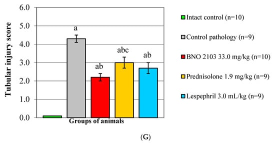 Chromium-induced nephropathy was used as an RF model []. It was induced by a single subcutaneous injection of 2.5% potassium chromate solution (Sigma-Aldrich, St. Louis, MO, USA) at a dose of 0.7 mL/kg in the original modification as described earlier [] on the first day of the experiment. Starting from the second day of the experiment, the animals received BNO 2103 at a dose of 33.0 mg/kg (the average therapeutic dose for humans extrapolated according to FDA recommendations []), Prednisolone at a dose of 1.9 mg/kg (ED50 for anti-inflammatory activity) and Lespephril at a dose of 3.0 mL/kg (n = 10) (the average therapeutic dose for humans extrapolated according to FDA recommendations). All the test samples were administered intragastrically daily for 20 days as suspensions prepared in the vehicle. The animals of the control groups received an equivalent amount of the vehicle. On completion of the study, the animals were sacrificed under general anesthesia with ketamine/xylazine (75/10 mg/kg, intraperitoneally) [] to obtain blood for biochemical assays and renal tissue for histological evaluation.