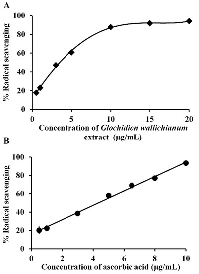 DPPH radical scavenging activity of (A) Glochidion wallichianum extract and (B) ascorbic acid, the positive control. Each point represents the mean ± SD (n = 3).