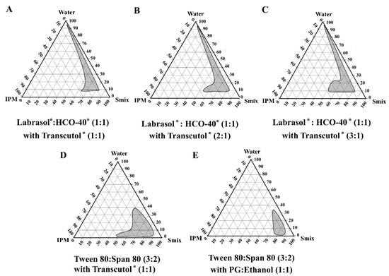 Pseudo-ternary phase diagrams comprising oil, water, and surfactant:cosurfactant mixtures (Smix) were constructed. IPM was used as the oil phase. Deionized water was used as the water phase. The Smix used in this study consisted of Labrasol® and HCO-40® (1:1) as surfactants and Transcutol® as a cosurfactant in the ratios (w/w) of surfactant:cosurfactant 1:1, 2:1, and 3:1 (diagrams A, B, and C, respectively). In addition, other Smix systems comprising Tween 80 and Span 80 (3:2) as surfactants and Transcutol® (diagram D), or PG:ethanol (1:1) (diagram E) as cosurfactants in the ratio of surfactant:cosurfactants 1:1, were tested for comparison. Therefore, a total of five pseudo-ternary phase diagrams was obtained.
