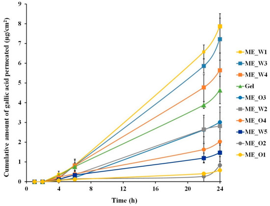 Skin permeation profile of the microemulsions containing Glochidion wallichianum extract. Each point represents the mean ± SD (n = 3–4).