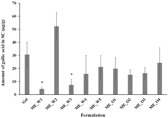 Disposition of gallic acid in the stratum corneum (SC) from the microemulsions containing Glochidion wallichianum extract. Each point represents the mean ± SD (n = 3–4). * Significant difference compared to the gel formulation (p < 0.05).
