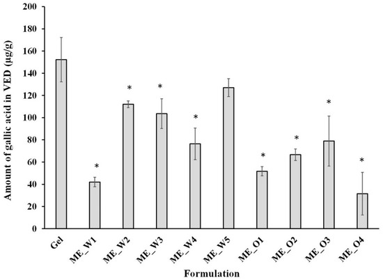 Disposition of gallic acid in viable epidermis and dermis (VED) from the microemulsions containing Glochidion wallichianum extract. Each point represents the mean ± SD (n = 3–4). * Significant difference compared to the gel formulation (p < 0.05).