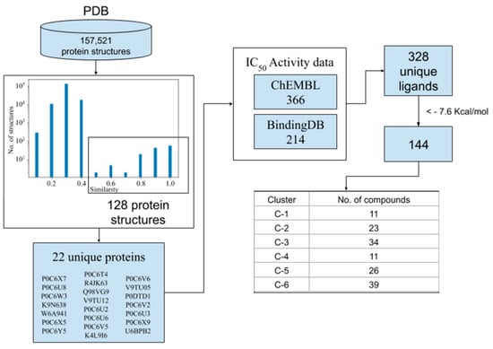 The diagram in Figure 1 shows the sequential step followed in this section. First, to identify protein structures with a similar binding site to the SARS-CoV-2 MPro, a set of 157,521 proteins contained in the PDB were compared by TMalign. Based on the alignment score, there is a clear difference between the number of structures before and after the value of 0.5. Therefore, a total of 128 crystal structures above this value were selected as similar to the Mpro structure. These structures correspond to 22 unique proteins from 10 different viral species. Once these proteins were identified, a search of active compounds against them was performed at the BindingDB and ChEMBL databases. A total of 328 unique active compounds against SARS-CoV (n = 319), MERS-CoV (n = 3) and 3C-like protease from human-CoV-NL63 (n = 6) were found. Therefore, these compounds were docked on the SARS-CoV-2 Mpro binding site as potential inhibitors. Based on the cut-off of −7.6 Kcal/mol (vina score for inhibitor N3), 144 compounds (Table S1) were selected as potential Mpro binders. The majority of the compounds retrieved from the databases were considered potential binders to SARS-CoV-2 Mpro, due to the high similarity among the proteases mentioned above, especially SARS-CoV and SARS-CoV-2 Mpro, which showed 96% similarity [24]. The potential binders were clustered in six groups using MACCS key fingerprints and the Tanimoto distance. This helped us to analyze diverse structural binders, highlighting those that could have some advantages on their functional groups for the binding.