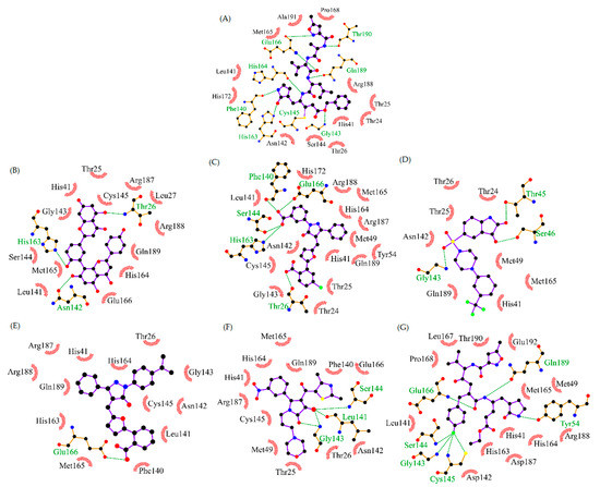 Potential lead inhibitors of SARS-CoV-2 Mpro obtained by comparison with others similar proteins. (A) N3 Structure. (B) CHEMBL63354 (D.S.: −10.2 kcal/mol, IC50 = 8.3 μM against 3CL-PRO SARS-CoV). (C) CHEMBL3808795 (D.S.: −9.7 kcal/mol, IC50 = 44.7 μM against 3CL-PRO SARS-CoV). (D) CHEMBL3099535 (D. S: −9.3 kcal/mol, IC50 = 100.0 μM against 3CL-PRO SARS-CoV). (E) 50176857 (D.S.: −8.9 kcal/mol, IC50 = 11.7 μM against 3CL-PRO SARS-CoV). (F) 503435553 (D.S.: −8.2 kcal/mol, IC50 = 101.0 μM against 3CL-PRO SARS-CoV. (G) 11243 (D.S.: −8.0 kcal/mol, IC50 = 100.0 μM against 3CL-PRO SARS-CoV). D.S.: Docking score. Hydrophobic interactions are shown in red and hydrogen bonds in green.