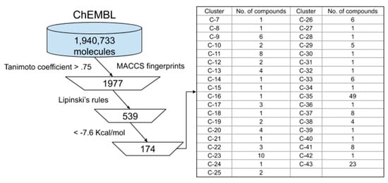 A ligand-based approach was used to screen 1,940,733 molecules from the ChEMBL database. Figure 3 summarizes this approach. The ChEMBL compounds were compared to inhibitor N3 using MACCS key fingerprints employing the Tanimoto coefficient. Using a cut off = 0.75, a total of 1970 compounds were found to be similar to inhibitor N3. Then, Lipinski’s rule of five was applied to these compounds and 539 compounds displayed this rule. These compounds were analyzed by molecular docking on the active site of SARS-CoV-2 and 174 compounds (Table S2) showed an affinity <−7.6 Kcal/mol, which were clustered as in the previous analysis.