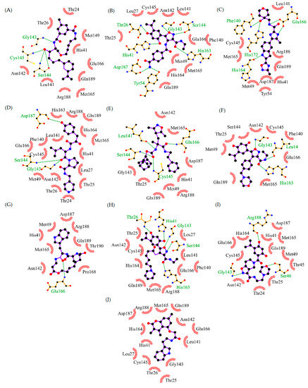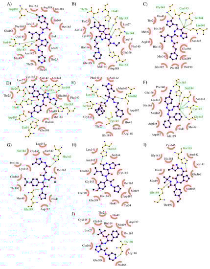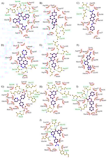 Top 10 compounds obtained by analyzing the interactions with key residues. The interactions of interest (I. I.) indicate a binding mode similar to the known inhibitors of SARS-CoV-2. (A) CHEMBL562054 (D.S.: −8.4 kcal/mol, 9 I. I.). (B) CHEMBL4300783 (D.S.: −8.3 kcal/mol, 9 I. I.). (C) CHEMBL20247011 (D.S.: −8.1 kcal/mol, 9 I. I.). (D) CHEMBL1940937 (D.S.: −9.1 kcal/mol, 8 I. I.). (E) CHEMBL64623 (D.S.: −8.3 kcal/mol, 8 I. I.). (F) DB07816 (D.S.: −8.5 kcal/mol, 8 I. I.). (G) CHEMBL1383217 (D.S.: −8.1 kcal/mol, 8 I. I.). (H) CHEMBL1866805 (D.S.: −8.0 kcal/mol, 8 I. I.). (I) CHEMBL1392860 (D.S.: −7.7 kcal/mol, 8 I. I.). (J) CHEMBL1740647 (D.S.: −7.7 Kcal/mol, 7 I. I.). D.S.: Docking score.