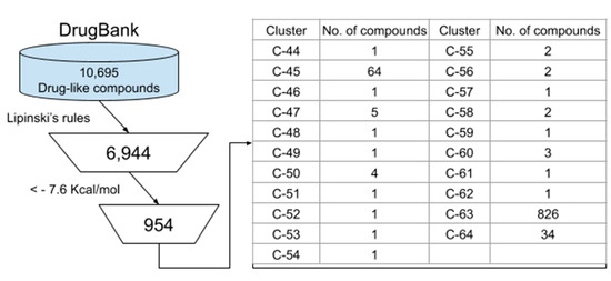 Apart from the previous evaluation, 10,695 compounds from the DrugBank database were screened as described in Figure 5. First, Lipinski’s rule was applied, and 5498 compounds were obtained. These compounds were analyzed on the active site of SARS-CoV2 Mpro by molecular docking. As a result, 946 compounds were predicted to bind Mpro better than the inhibitor N3 (Table S4). The compounds were clustered in 21 groups (Table S5) and the lead drug of the top 10 clusters is shown in Figure 6.