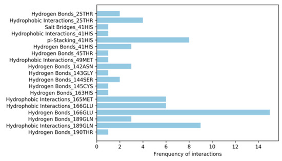 Virtual screening on SARS-CoV-2 Mpro showed the promiscuity of the binding site. To select the most promising inhibitors, the leaders of each screening were compared to structurally available ligands of SARS-CoV-2 Mpro. The Diamond Light Source method has just made available the crystal structure of SARS-CoV-2 Mpro binding non-covalently to 22 compounds (Table S6). To identify the key interaction for binding the active site, the protein-ligand interaction profiler (PLIP) was used to calculate the molecular interactions on each complex. These interactions are summarized in Figure 7. This figure shows that the most common interaction is the hydrogen bond with the amino acid Glu166. This interaction is very important because Glu166 helps maintain the shape of the active site [24]. Additionally, in flavonoid inhibitors, Glu166 and Gln189 play a key role on the binding force to SARS-CoV Mpro [36]. Moreover, previous studies have shown that His41 plays an important role in the active site stabilizing the binders through hydrogen binding [36,37]. In this study, the results showed that His41 also participated in π-stacking interactions.