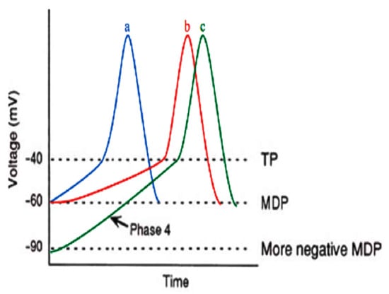 Phase 4 depolarization in a pacemaker cell [45]. MDP, maximum diastolic potential; TP, threshold potential. Blue (a) curve is normal action potential; red (b) curve is reducing If, which renders the slope of phase 4 less steep, therefore, the time required to reach threshold TP is elevated; green (c) curve means the MDP is more negative, thus the time required to reach TP is augmented.