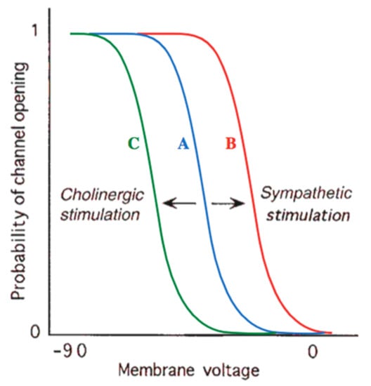 Effects of cholinergic and sympathetic stimulation on pacemaker channel. At any given voltage, there exists a chance between 0 and 1 that a certain channel will be disclosed. Compared with normal baseline behavior (curve A), sympathetic stimulation (curve B) or treatment with anticholinergic drugs shifts this possibility to a higher value or any given level of membrane voltage, thus elevating the number of disclose channels and the rate at which the cell will free. Curve C shows that parasympathetic cholinergic stimulation (or treatment with a β-blocker, which antagonizes sympathetic stimulation) has the contradictory effect, lowering the probability of a channel being disclose and therefore blocking depolarization [45].