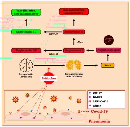 The effect of beta-blockers in the renin–angiotensin–aldosterone system. (Modified from [70]). CD147, cluster of differentiation 147; COVID-19, coronavirus disease 2019.