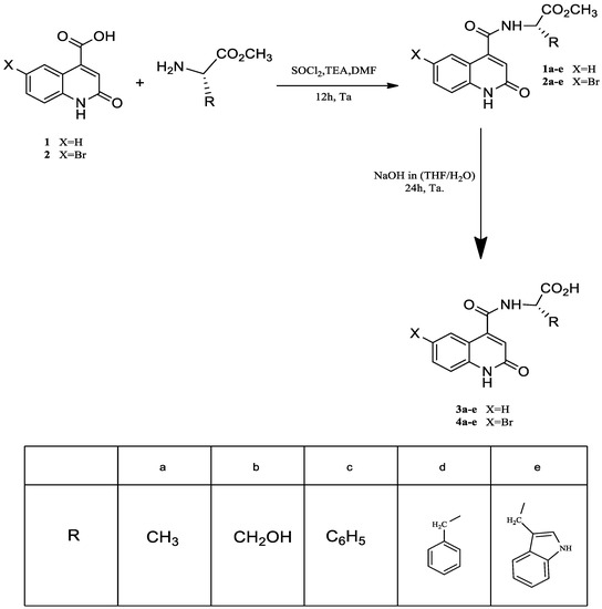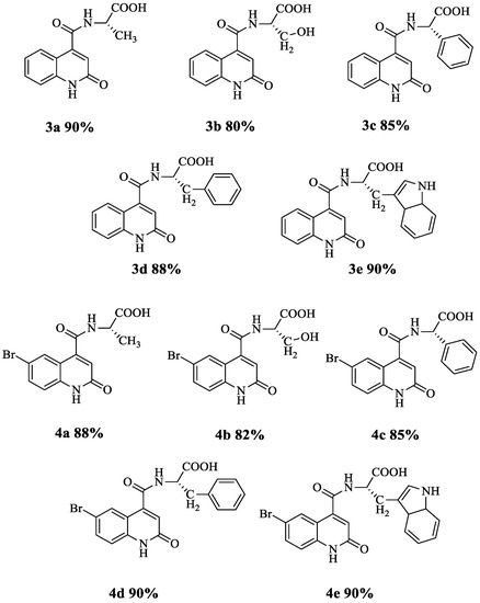 Recently, Moussaoui et al. [66] reported a new series of 2-oxo-1,2-dihydroquinoline carboxamides 1a–e and 2a–2e based on amino acid methyl esters and studied their antibacterial activity. As a continuation study, we synthesized ten new structures of amino acid derivatives of quinolines following a three-step reaction (Scheme 1).