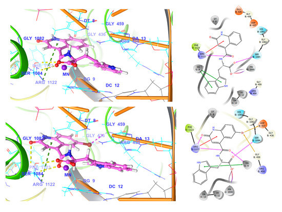 Interactions of quinoline amino acids at the fluoroquinolone binding site (magenta ball and sticks) of S. aureus DNA-gyrase subunit A (PDB ID: 2XCT) in 3D (left panel; protein chains in yellow/green cartoon; DNA in orange; key interacting residues in cyan sticks; Mn2+ ion shown as a violet sphere; interactions as dashed lines; color of interaction type: yellow—hydrogen bonds; green.—pi-cation interaction; cyan—pi-pi stacking; dark pink—salt bridge; magenta–halogen bond) and in 2D (right panel). Top: compound 3e. Bottom: compound 4e.