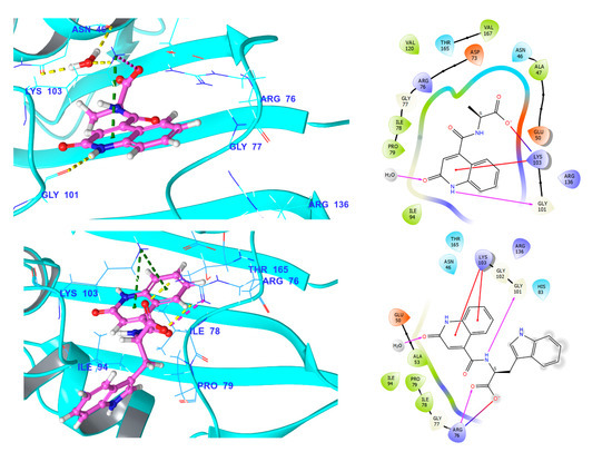 Glide docking scores and calculated Prime/molecular mechanics-generalized Born surface area (MM-GBSA) binding free energies (ΔGbind) of co-crystallized ligands and the docked amino acid derivatives of quinolines.