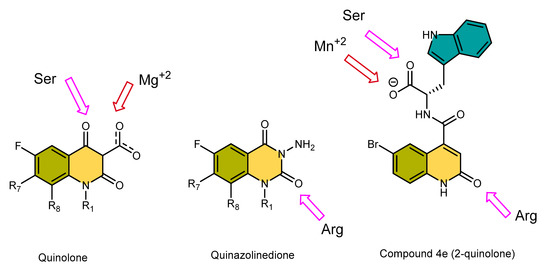 Key interacting structural moieties of quinolones and quinazolinediones in the fluoroquinolone binding site compared to the predicted interactions of compound 4e (color scheme: red arrow-metal ion interaction; pink arrow–H-bond interaction).