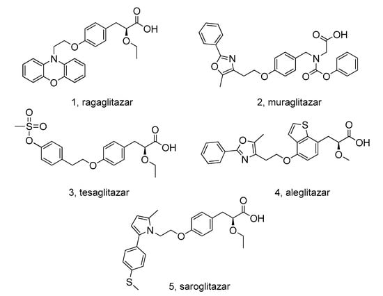 A number of dual PPAR agonists, demonstrating promising results in animal studies, have been tested in clinics. However, to date, only one, saroglitazar (Figure 1), has been approved in India []. All the others—ragaglitazar, muraglitazar, tesaglitazar, aleglitazar (Figure 1)—failed to gain regulatory approval, primarily due to adverse side effects, that include hepatotoxicity, cardiotoxicity, and gastrointestinal toxicity [,].