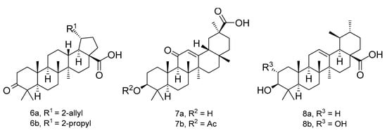 The triterpenic acids (Figure 2) chosen in this work are known to have hypoglycemic properties. Thus, certain lupane-type triterpenoids, such as betulonic 6a and dihydrobetulonic 6b acids, have been shown to possess alpha-glucosidase inhibitory activities [,]. Glycyrrhetinic acid 7a is known to have several targets for its hypoglycemic actions: PPAR-γ, C/EBP-α, MAPK activation and pHSL []. In the case of ursolic acid 8a, the validated targets include PPAR-α, SREBP-1c, HSL translocation, perilipin A expression, ATGL and others. Glycyrrhetinic acid derivatives have been reported to possess therapeutic antidiabetic potential []. Of particular, recent interest is corosolic acid 8b that has a pronounced antidiabetic effect with a confirmed mechanism of AMPK activation and α-amylase inhibition []. Some derivatives of corosolic acid have also been shown to have pronounced hypoglycemic activity in vivo [].