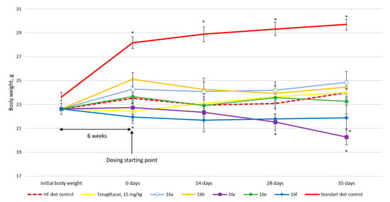 Dynamics of changes in body weight of animals during the experiment. * p < 0.05 compare to HF diet control. 6 week—period on HF-diet prior to introduction of testing compounds. Dosing starting point—first introduction of tesaglitazar, 16a, 16b, 16c, 16e, 16f. 16a–f were introduced at a dose of 30 mg/kg.