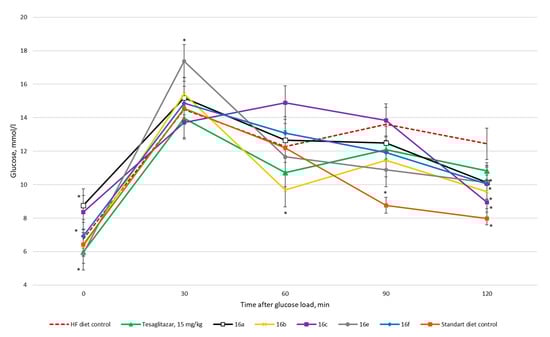 Oral glucose tolerance test results. 16a–f were introduced at a dose of 30 mg/kg. * p < 0.05 compare to HF diet control.