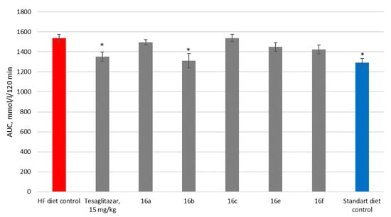OGTT results. Area under glycemic curve (AUC). 16a–f were introduced at a dose of 30 mg/kg. * p < 0.05 compare to HF diet control.