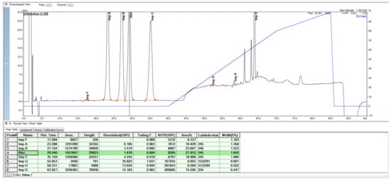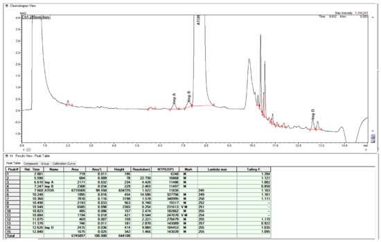With use of the column Shim-pack XR II C18 75 mm × 3 mm, 2.2 µm, perfect results were obtained, from the aspect of successful, rapid, and reproducible separation of atorvastatin and its impurities, yielding a number of theoretical plates (NTP) of about 12106 regarding the main peak of atorvastatin, as can be seen from the chromatograms on Figure 2. The theoretically calculated number of theoretical plates using the equation N = L/2dp [24] corresponded to the software calculated number of about 11,835 for the peak of atorvastatin, which can be seen in the table below the chromatogram presented in Figure 4.